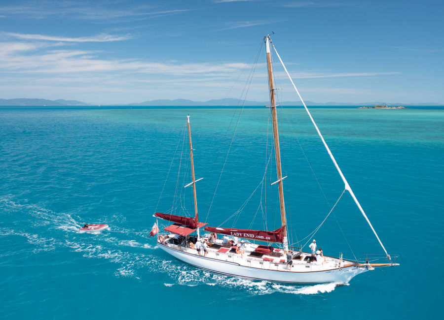 The beautiful Lady Enid exploring the Aboriginal cultural heritage of the Whitsundays and snorkelling magnificent Hook Island. A cut above, Lady Enid promises barefoot luxury and comfort on your Hook Island sailing tour. An adults only experience with impeccable service. Delectable meals are provided, and sparkling wine is served with antipasto in the afternoon.